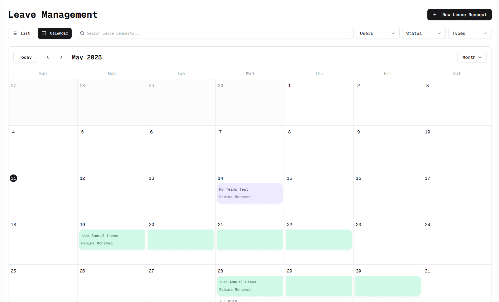 Calendar view of all your team's leaves, so you can see who's off and when. List view is also available.